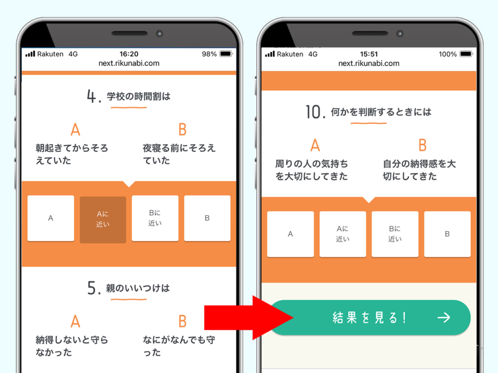 価値観に近いものを選択し、結果を見るをタップ。